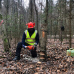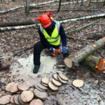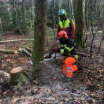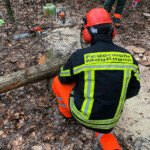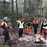 Am Samstagmorgen ging es für den praktischen Teil in den Wald. Zu Beginn stand der Check der persönlichen Schutzausrüstung der einzelnen Teilnehmer auf dem Programm. Anschließend galt es das am Vorabend theoretisch Erlernte nun in der Praxis anzuwenden. Hierbei fällte jeder Teilnehmer mehrere Bäume, die anschließend entastet und auf Transportlänge gesägt wurden. Die Ausbilder stellten auch gezielt Situationen nach, bei denen Bäume unter Spannung gesägt werden mussten. Hierfür wurden mehrere Bäume gefällt, sodass Sie anschließend ineinander verkeilt waren. Solche Situationen sind sehr häufig nach Unwettern anzutreffen und bedürfen besonderer Vorgehensweise beim Fällen und Zersägen.