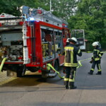 Umgehend ging ein Trupp unter schwerem Atemschutz mit einem C-Rohr zur Brandstelle vor und konnte Entwarnung geben „Feuer aus“. Die Spülmaschine wurde durch zwei Trupps unter Atemschutz ausgebaut und final mit der Wärmebildkamera kontrolliert.