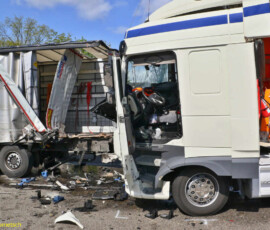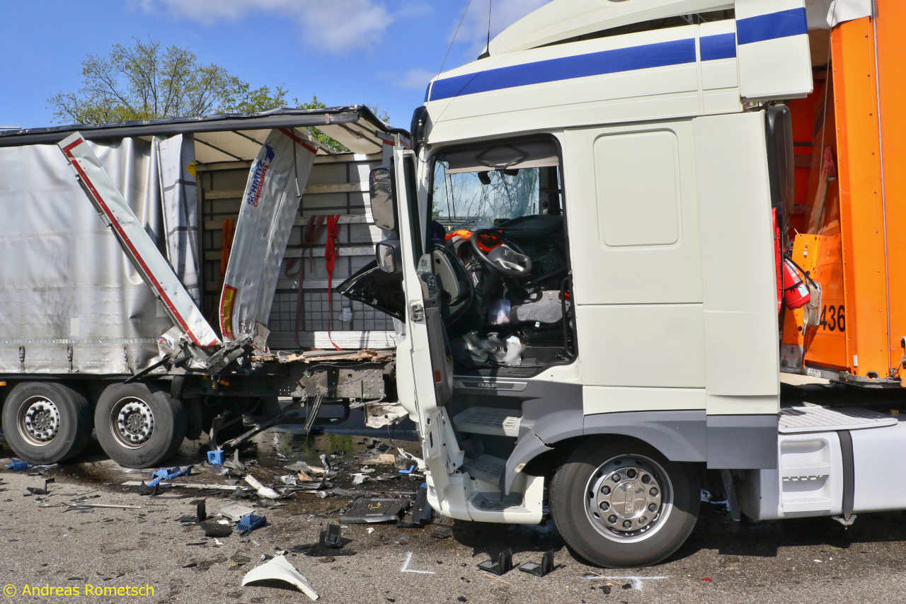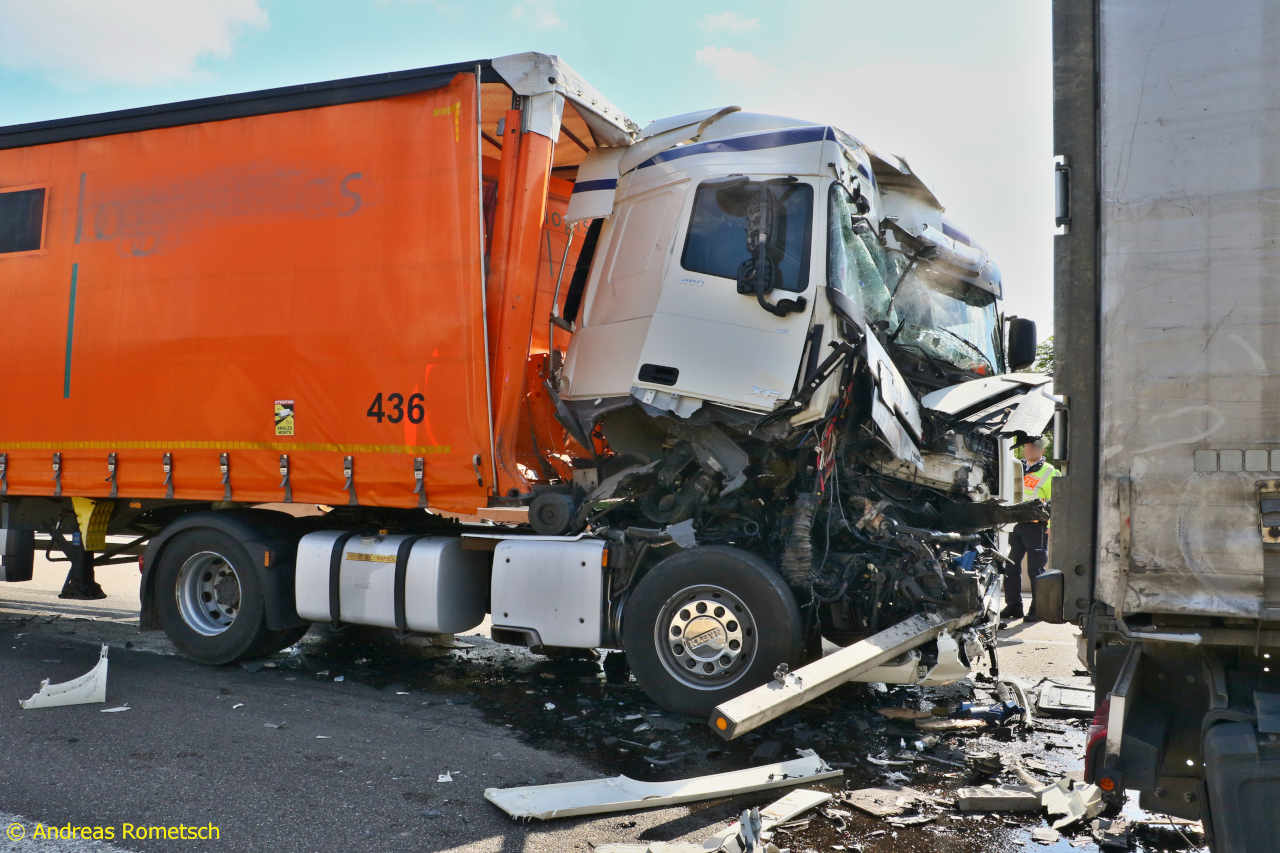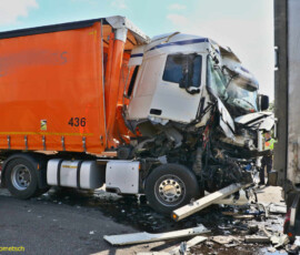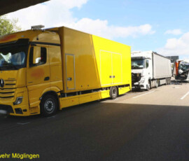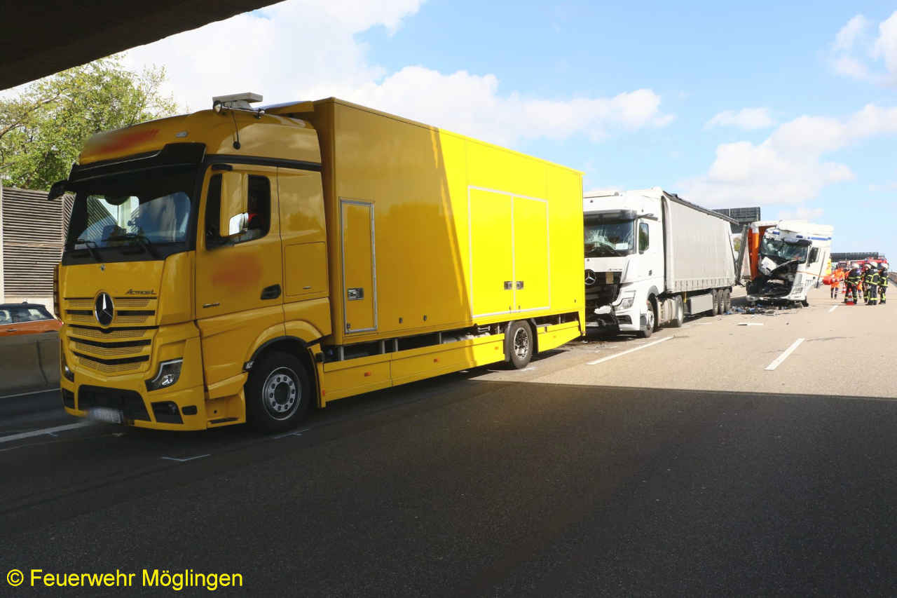 Auf Höhe der Anschlussstelle Stuttgart-Zuffenhausen übersah ein LKW-Fahrer mutmaßlich ein Stauende, versuchte noch, nach links auszuweichen, kollidierte aber dennoch mit einem auf dem rechten Fahrstreifen stehenden Lkw. Durch die Wucht der Kollision wurde das Fahrzeug auf einen davor stehenden Lkw geschoben. Bei dem Unfall wurde glücklicherweise niemand schwer verletzt.